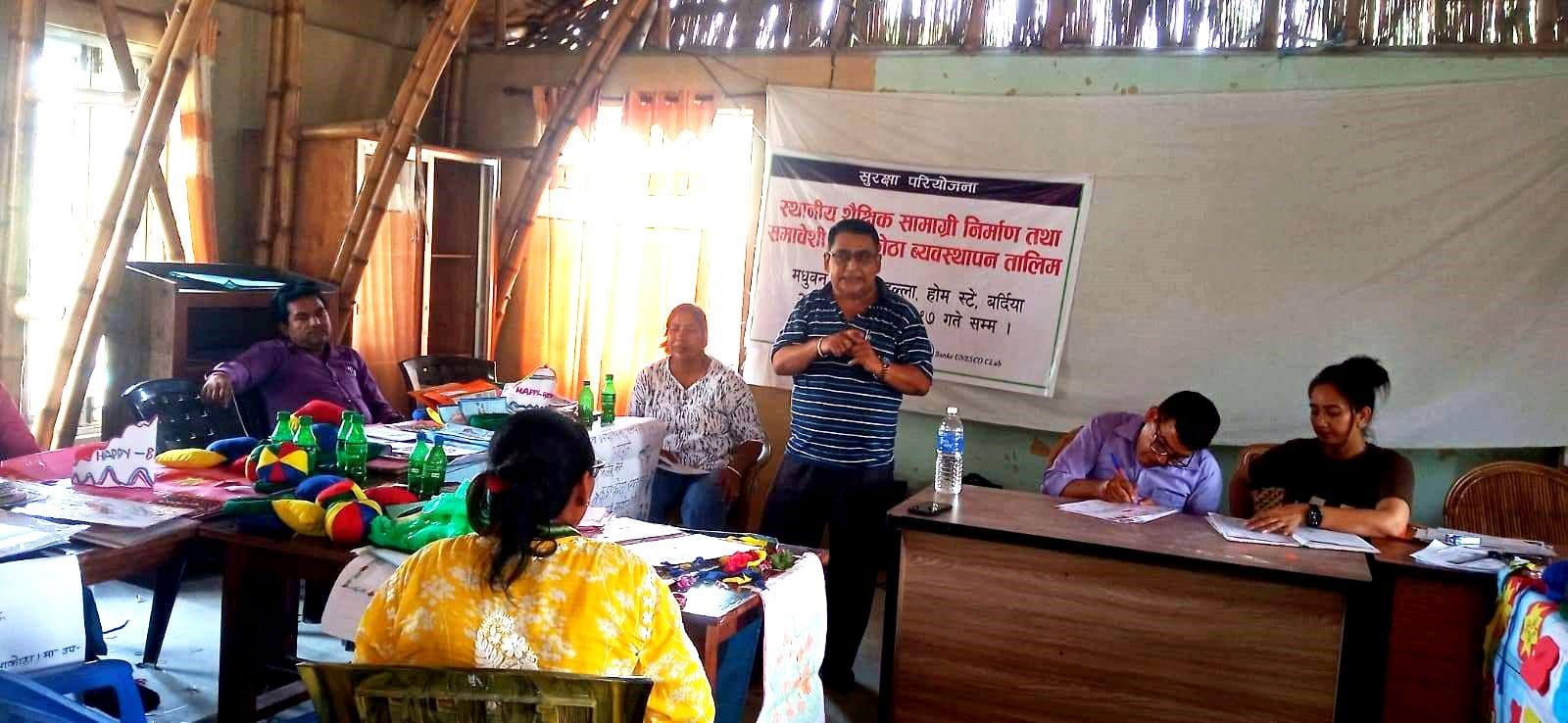 नेपालगन्ज, जेठ १८ । बर्दिया जिल्लाको राजापुर र मधुवन नगरपालिकाका प्रारम्भिक बालविकास (ईसीडी) र कक्षा १ का शिक्षकहरूकालागि सञ्चालन गरिएको चारदिने तालिम सम्पन्न भएको छ । बाँके युनेस्को क्लबद्धारा प्लान इन्टरनेशनल नेपालसंगको साझेदारीमा सञ्चालित ‘सुरक्षा परियोजना’ अन्तर्गत मधुवन नगरपालिकाको आयोजना र राजापुर नगरपालिकाको सहकार्यमा मधुवन नगरपालिकाको डल्लामा ‘स्थानीय शैक्षिक सामाग्री निर्माण तथा कक्षा कोठा व्यवस्थापन’ तालिम सञ्चालन गरिएको थियो । तालिमको समापन गर्दै मधुबन नगर पालिकाका नगर उपप्रमुख अनिता चौधरीले स्थानीय सरकार र संघ सस्थाहरुको सहकार्यमा गरिएका यस्ता कार्यक्रमले शिक्षाको विकासमा बिशेष योगदान पुराउने बताउनुभयो । उहाँले यस्ता तालिमले शिक्षालाई गुणस्तरीय र व्यवहारिक बनाउन पनि ठुलो सहयोग गर्ने बताउनुभयो । बाँके युनेस्को क्लबका प्रमुख संरक्षक प्रवेज अलि सिद्दिकीले युनेस्कोले संचालन गरेका क्रियाकलाप र यसको महत्व तथा उदेशय बारे प्रस्ट पार्दै स्थानीय शैक्षिक सामाग्रीले पठनपाठनमा सहजता हुने बताउनुभयो । मधुवनका शिक्षा शाखा प्रमुख नारायण प्रसाद खनालले स्थानीय शैक्षिक सामग्रीको प्रयोगले बालबालिकाको सिकाईलाइ कक्षा कोठासंग जोडन टेवा पुग्ने भएकोले यस्ता तालिमले शिक्षकको क्षमता बिकासमा सहयोग पुग्ने बताउनु भयो । तालिमका सहभागी शिक्षिका प्रभा भुषालले तालिम निकै फलदायी भएको र यसबाट आफुहरुको क्षमता बिकास भएको र सिकेका कुरा कक्षा कोठामा लागु गर्ने प्रतिबद्धता ब्यक्त गर्नुभयो । सो चारिदने तालिमको समापन सत्रको अध्यक्षता गरिरहनु भएका बाँके युनेस्को क्लबका अध्यक्ष रबि कुमार तुलाधरले तालिममा सिकेको शिपलाइ कक्षा कोठामा लागु गर्न र बालबालिकाको सिकाईमा सुधार ल्याउन आग्रह गर्नुभयो । समापन कार्यक्रमको संचालन परियोजना संयोजक ईश्वर बिकले गर्नु भएको थियो भने सो अवसरमा क्लबका बरिष्ठ उपाध्यक्ष्य पंचम गुरुङ तथा फिल्ड सुपरभाइजर सावित्रा भाटको पनि उपस्थिति रहेको थियो । तालिमको सहजीकरण प्रशिक्षक झल कुमारी कार्कीले गर्नु भएको थियो । तालिम अन्तरक्रियात्मक सत्र, समूहगत कार्य र व्यवहारिक अभ्यासहरू सहित सञ्चालन गरिएको थियो । कम लागत वा शून्य लागतमा शिक्षण सिकाइ सामग्री निर्माण गर्ने तरिका र समावेशी कक्षा व्यवस्थापन प्रविधिको विकासमार्फत शिक्षण अभ्यासमा सुधार ल्याउन शिक्षकहरुको क्षमता विकास गर्ने उद्देश्यले उक्त तालिमको सञ्चालन गरिएको बाँके युनेस्को क्लबले जनाएको छ । तालिममा राजापुर नगरपालिकाका १० र मधुवन नगरपालिकाका २९ जना गरेर ३९ जना शिक्षकहरुको सहभागिता रहेको थियो । तालिममा सहभागी शिक्षकहरूले कक्षा कोठामा प्रत्यक्ष र